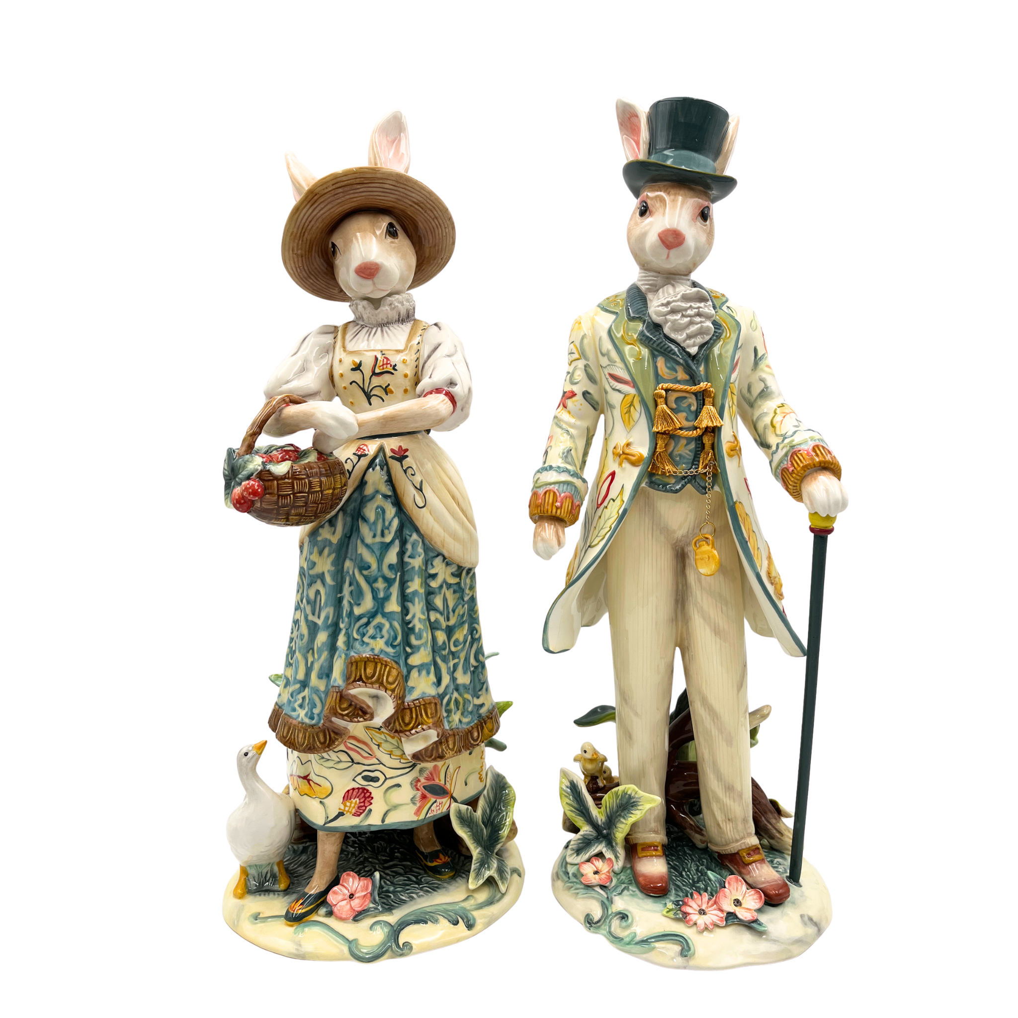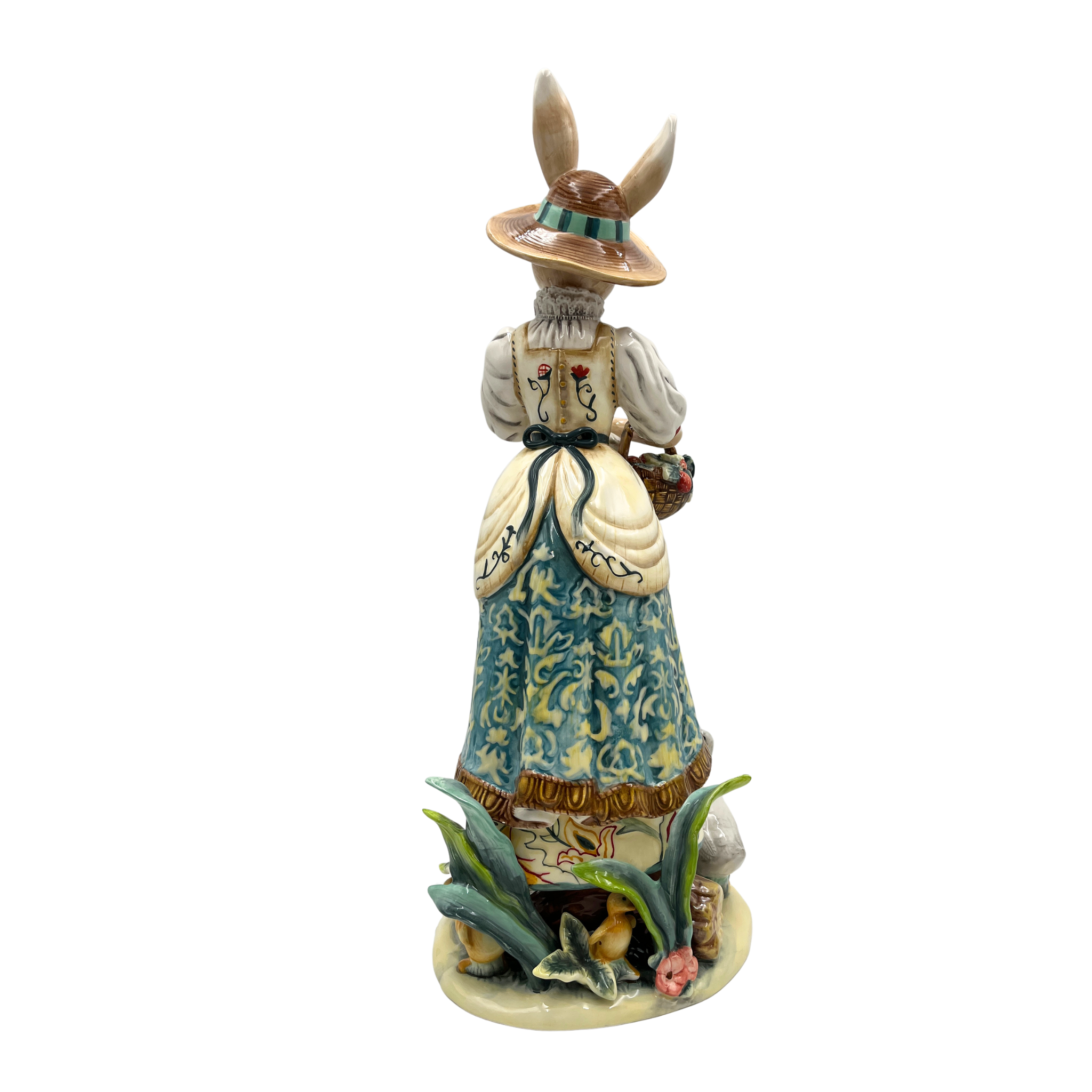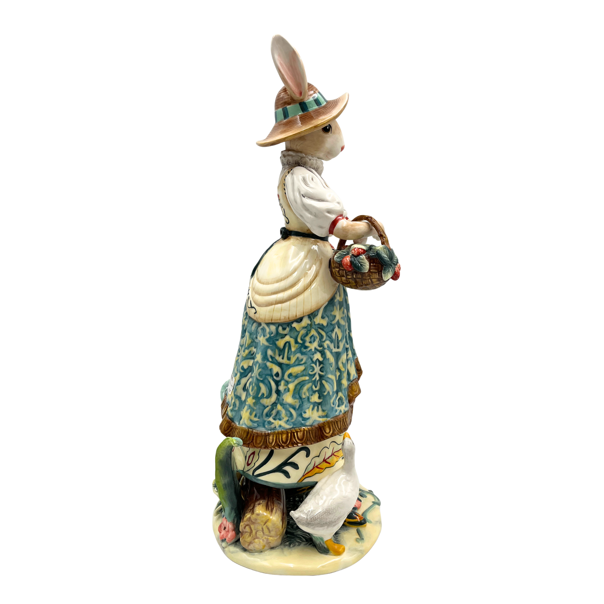 Diese bezaubernde Porzellanfigur ist ein wahrer Blickfang für jeden Raum. Die „Hasenfrau mit Blumenkorb“ besticht durch ihre detailreiche Gestaltung, elegante Farbgebung und liebevolle Handbemalung aus feinstem Porzellan. Sie zeigt eine anmutige Hasen-Dame in traditioneller Tracht, mit einem geflochtenen Korb voller zarter Blumen, umgeben von einem kunstvoll gestalteten Sockel mit naturhaften Elementen wie Blüten und Tierfiguren.