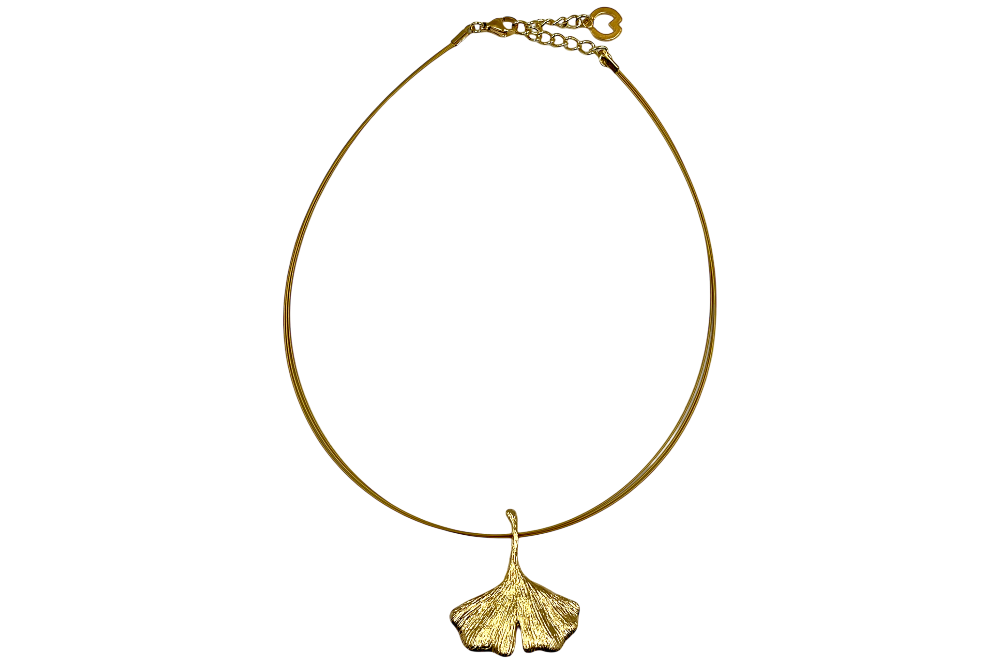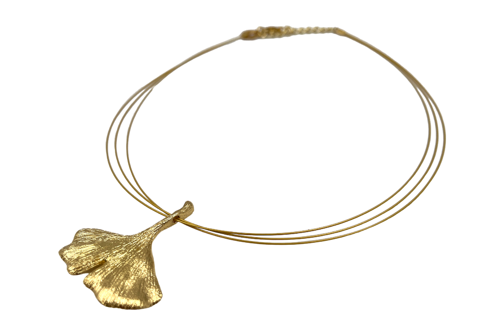 Der Anhänger ist aus 925er Sterlingsilber gefertigt und mit 24 Karat Feingold vergoldet. Mit seiner Größe von ca. 4 × 4 cm wirkt das stilisierte Ginkgo-Blatt leicht und zugleich ausdrucksstark. Drei feine, ebenfalls vergoldete Edelstahldrähte bilden die Kette und verleihen dem Collier eine moderne, schwebende Optik. Die Länge ist von 42 bis 47 cm verstellbar.